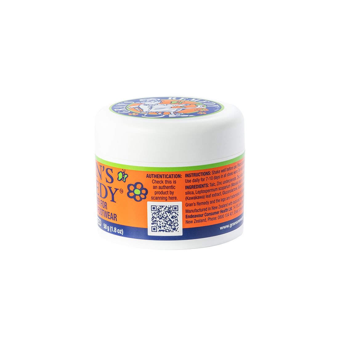 Potassium Aluminium Sulphate, Zinc Oxide, Zinc Undecylenate, Talc, Manuka Oil, Kawakawa Oil and Citrus Plaisir.